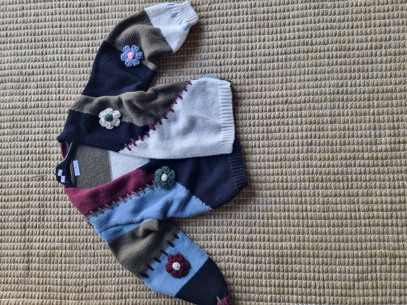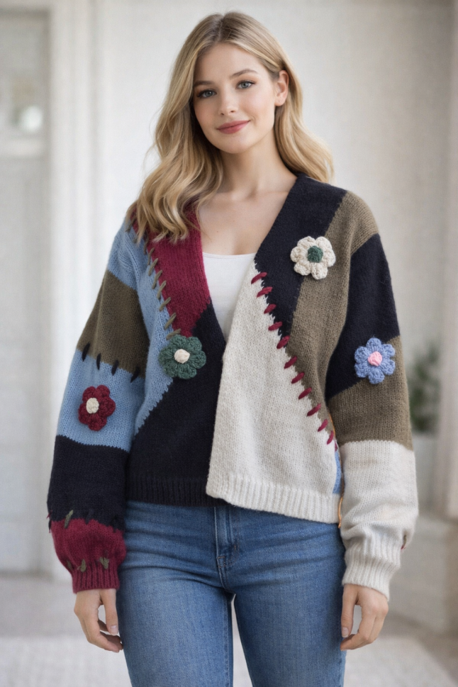 Уникална плетена жилетка с пачуърк дизайн и ръчно изглеждащи цветни апликации. Съчетава различни нюанси – за уютна и артистична визия. Декоративните шевове и плетените цветя придават характер и индивидуалност на модела.