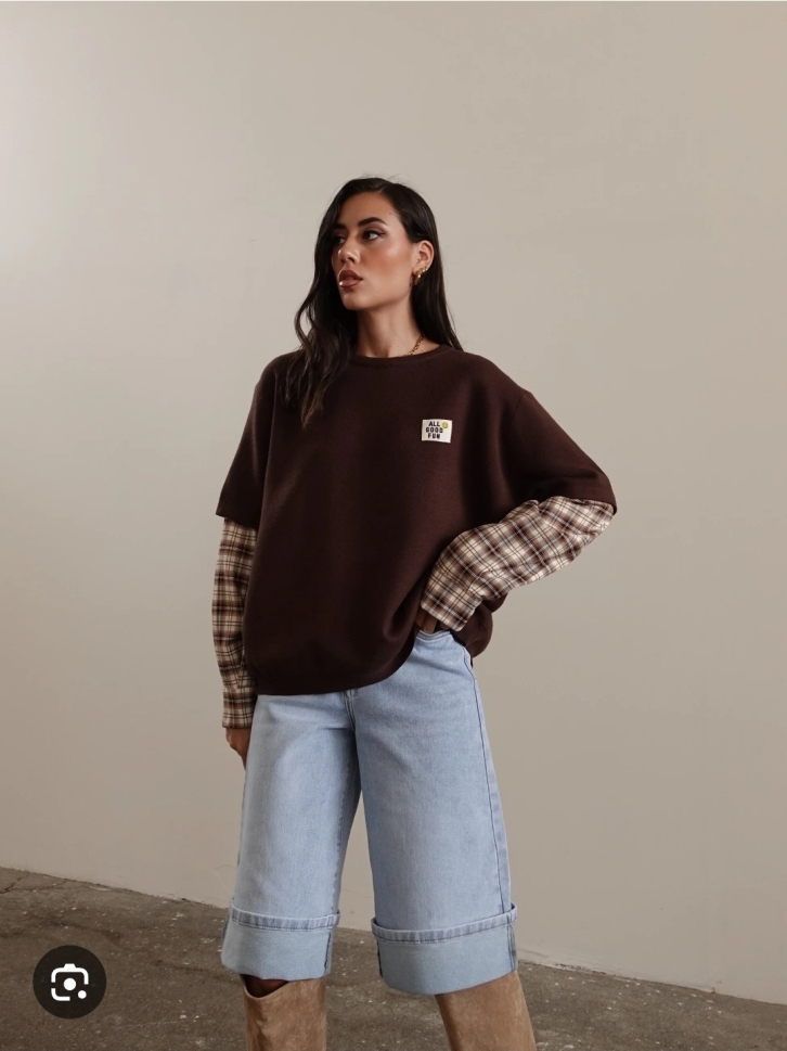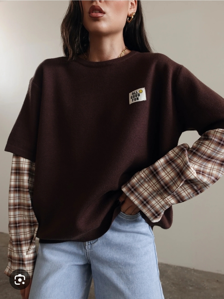 Стилна и удобна блуза в универсален размер, изработена от мека и приятна материя. Моделът е в тъмен кафяв цвят с вградени ръкави от каре, създаващи модерен „layered“ ефект. Подходяща за ежедневието и за по-небрежни визии. Малък надпис отпред с позитивно послание добавя свеж акцент.