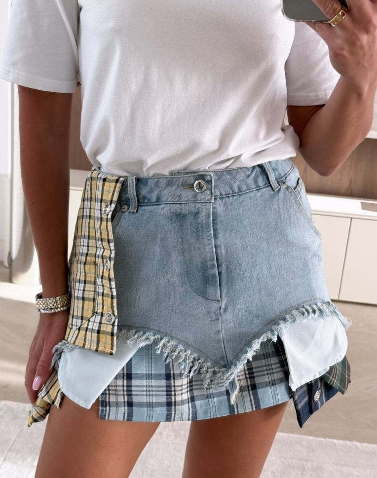 Дизайнът впечатлява с комбинация от различни платове и карета, декоративни копчета и леко разнищен дънков подгъв, които придават модерна street-style визия. Асиметричните панели и контрастните десени създават ефектен и оригинален силует.