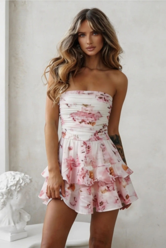Стилна къса рокля с нежен флорален десен в розово и бяло. Моделът е без презрамки, с прилепнала горна част и разкроена многопластова пола за игрив и женствен силует. Отдолу е подплатена с шорти за допълнително удобство и сигурност при носене. Универсален размер – подходяща за XS, S и M.